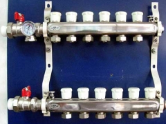 功能型:功能性集分水器除具备标准型集分水器的所有功能外,同时还具有温度、压力显示功能、流量自动调节功能、自动混水换热功能、热能计量功能、室内分区温度自动控制功能、无线及远程遥控功能,为了防止锈蚀,集分水器一般采用耐腐蚀的金属或合成材料制成。常用的材料有铜、不锈钢、铜镀镍、合金镀镍、耐高温塑料等。集分水器(含连接件等)的内外表面应光洁,不得有裂纹、砂眼、冷隔、夹渣、凹凸不平等缺陷,表面电镀的连接件,色泽应均匀,镀层牢固,不得有脱镀的缺陷。